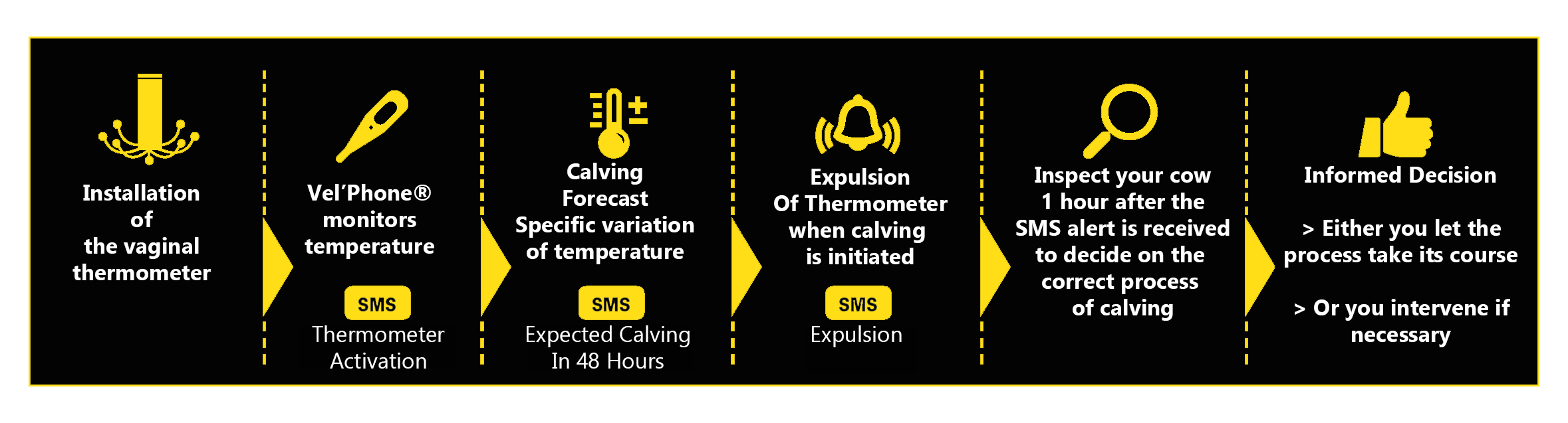 The Vel'Phone® service predicts and detects calving through a vaginal thermometer that continuously monitors the temperature of the animal. It emits an alarm when the water bag is expelled. The calving prediction is based on the elevation and the sudden drop of the cows vaginal temperature a few hours prior to calving thus enabling you to intervene in the event of complications. The Customer is alerted 48 hours prior to calving allowing you, the customer, peace of mind. With more than 99% of detected calvings, it is the most reliable and accurate tool on the market.